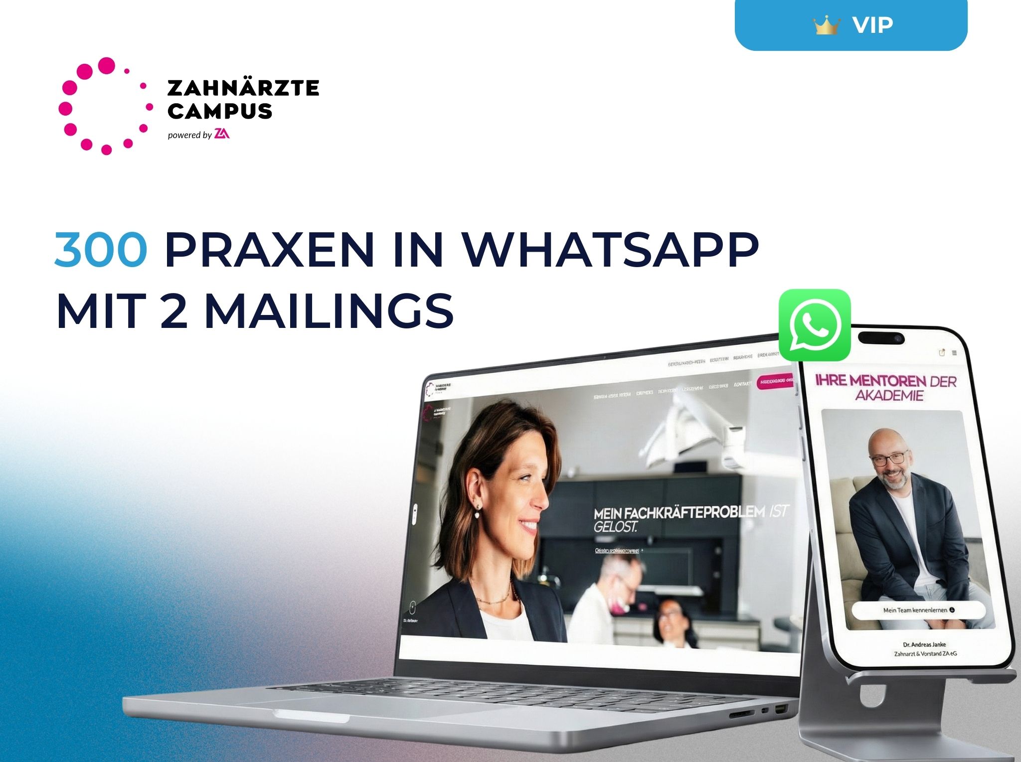 Der Campus ist Fullservice-Dienstleister für Zahnarztpraxen und übernimmt Abrechnung bis hin zum Controlling. Über 2 Mailing-Strecken und einer Funnel-Strategie über Whatsapp wurde ein Eisbrecher-Offer von 14.000€ platziert als vertrauensbasierter Einstieg in hochpreisiges Retainer-Geschäft.